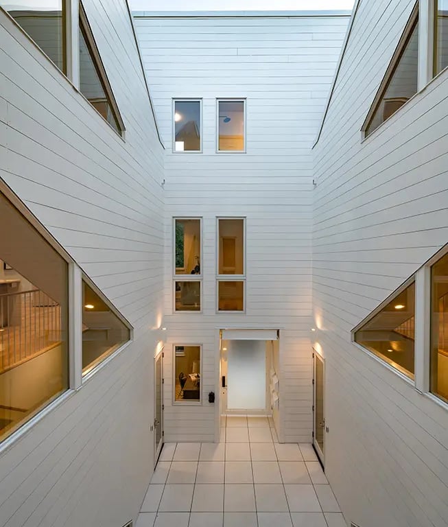 This building, designed by EL Studio, contains four two-story three-bedroom homes situated around a central courtyard. The lower units feature private sunken gardens while the upper units each enjoy a private roof deck. The project cleverly balances openness and privacy within an architectural envelope that is proudly contemporary while also making clear and direct references to the historical neighborhood which it inhabits. (Images courtesy of El Studio)